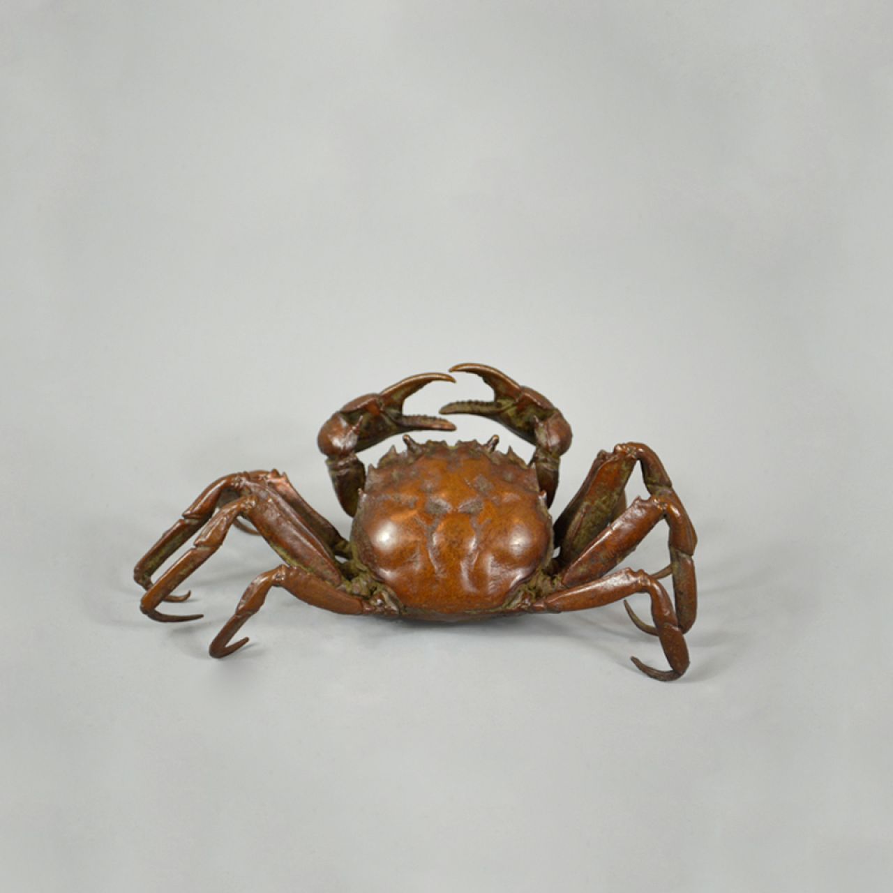 说明:此物件采用铜质,取螃蟹造型,构思巧妙,形态逼真,个体硕大,宛如一只刚刚出笼的肥美时令鲜蟹。一只螃蟹寓意“一甲”,中国古代科举制度中殿试一甲三名,赐进士及第,第一名称状元、鼎元,二名榜眼,三名探花,合称三鼎甲。此物可作笔架,茶席盖质,除实用意义外,更多的则是带有观赏陈设性,供置于书斋的案几上,与砚相伴,与文人相对,符合主人的情趣。