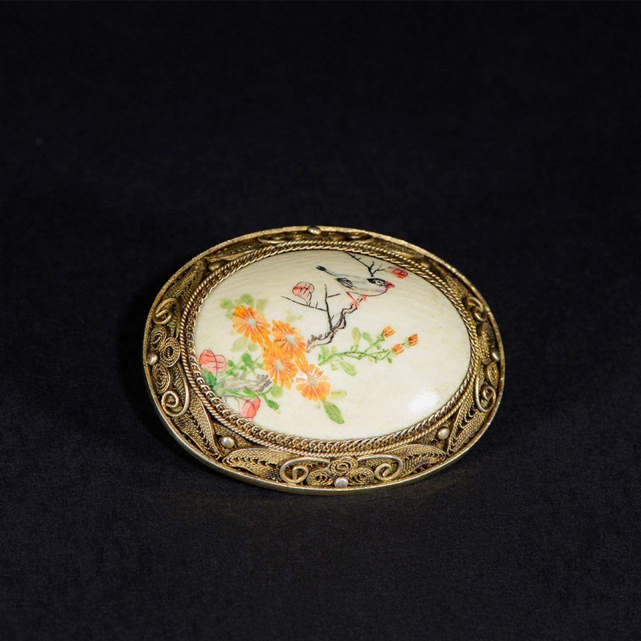这一小胸针工艺非常精致,首先采用珍贵的xiang牙原料,呈牙白色,上工笔彩绘喜鹊登枝图,周围菊花盛开,好一幅喜气洋洋的景象!再看在小如鸟卵之上绘制如此复杂的图案难度是可想而知的,可达到微雕的效果,特别是喜鹊的绘制尤为生动,麻雀虽小,五脏俱全,羽毛、鸟喙、爪刻画精确到位,笔道细如发丝,运笔极见功力。外包纯银花丝工艺,工艺精湛,行云流水般的纹饰,氧化泛黑的包浆,使得这枚胸针愈发古朴高贵,绝对是品味极高的配饰。