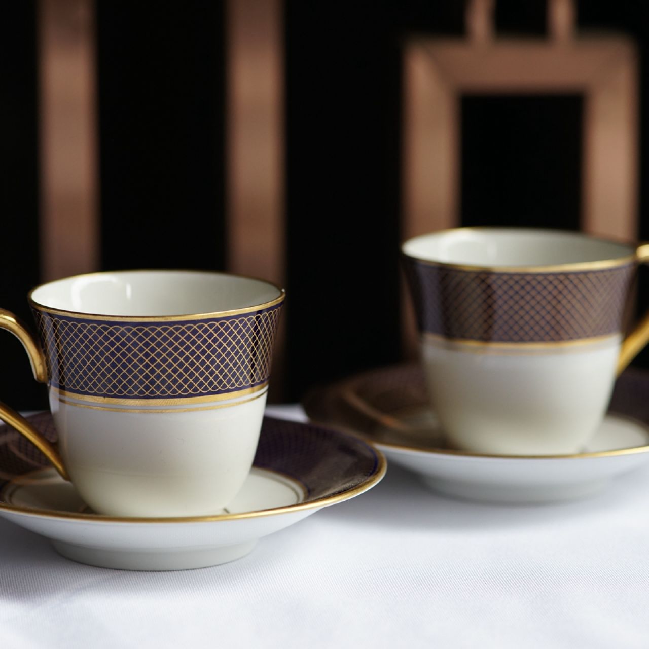 鉴赏:来自德国Bavaria巴伐利亚Alka Kunst Kronach公司,1872年起始,咖啡杯造型优雅大方,深蓝底色上描绘着网格状的装饰,灵动细腻,耐人寻味。