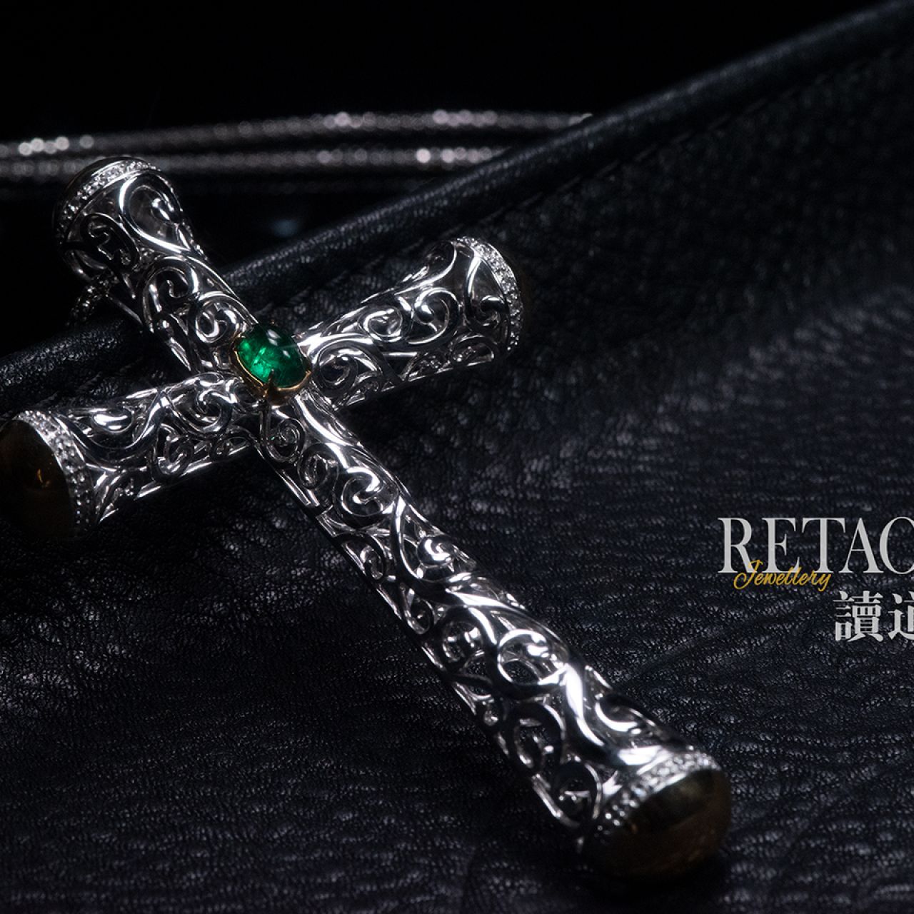 首页> 玉翠珠宝> 翡翠> 白金镶祖母绿镂空十字架吊坠