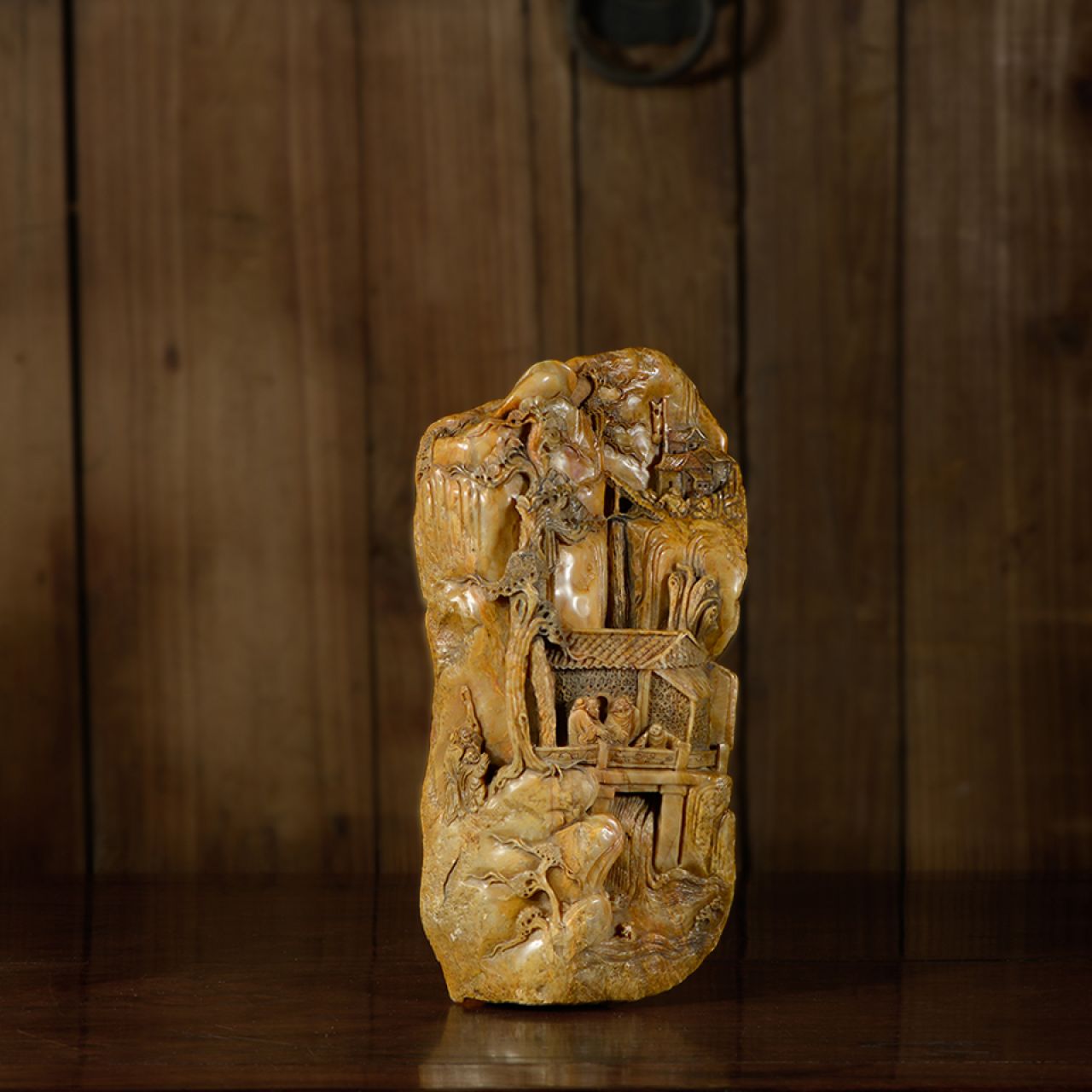 再次,石尽其用,雕尽其艺。寿山石在雕刻之前先“相石”,比如这一件采用寿山石山料,先要仔细揣摩石料外观形象、石质、状态,要“因材施艺”,这一点在这件石雕上得到了很好的诠释。正面满工,分三部分,上内凹形似山峰,雕松树,右侧饰阁楼、人物;中以凹陷处雕一瀑布直流而下,前方凸起的一块石头雕一座楼台,正好坐落于瀑布前方,围栏三人畅谈,左边还有一位老者正在赶来;下方瀑布从阁楼下方流出,整体构思巧妙,别具匠心。背后更多的保留了原石皮,以浅浮雕雕山涧小屋及高耸入云的大树,极具写意风格。真正做到了运用了“雕尽其艺”,本石雕集圆雕、浮雕、透雕、镂雕、高浮雕、浅浮雕等多种工艺与一体,积淀千年的精妙刀功,让人惊为天物。